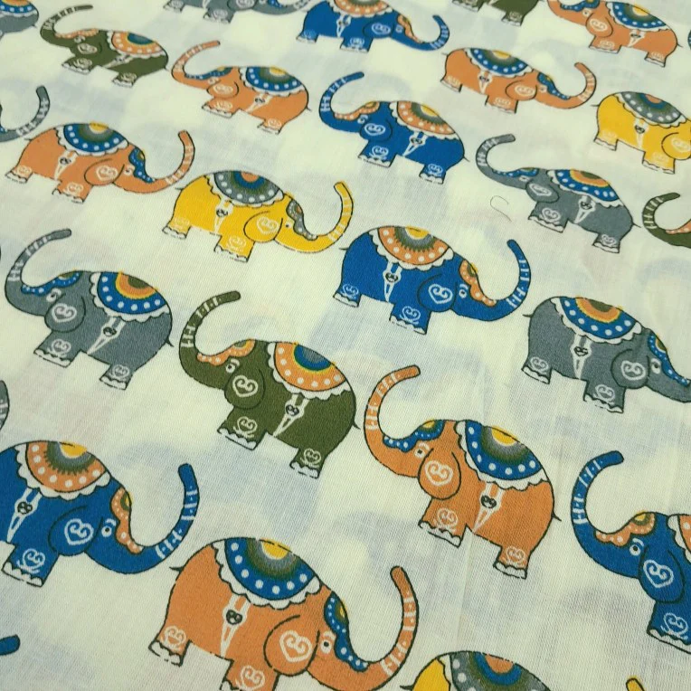 Playfully printed cotton fabric featuring a charming multicolor elephant motif in vibrant colors. The quirky and artistic design adds a fun and lively touch. Soft, breathable, and perfect for casual and creative projects.