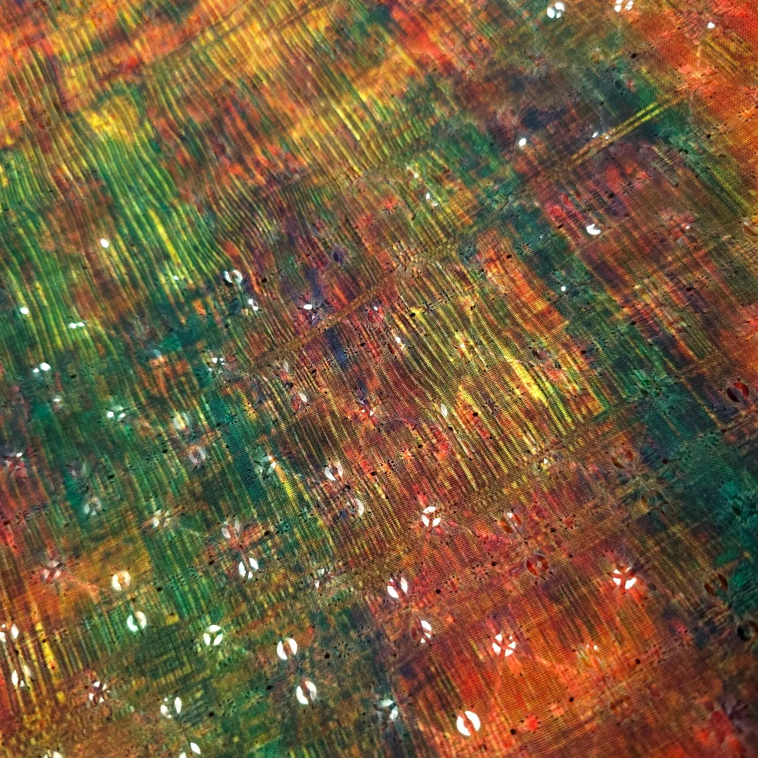 Mehek Abstract Print of Orangel & Green Cotton Fabric with Sequins
