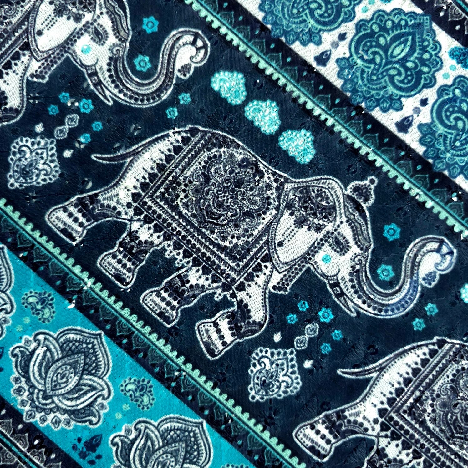 Mehek Royal Elephant & Lotus Printed Stripe on Blue Cotton Fabric with Sequins