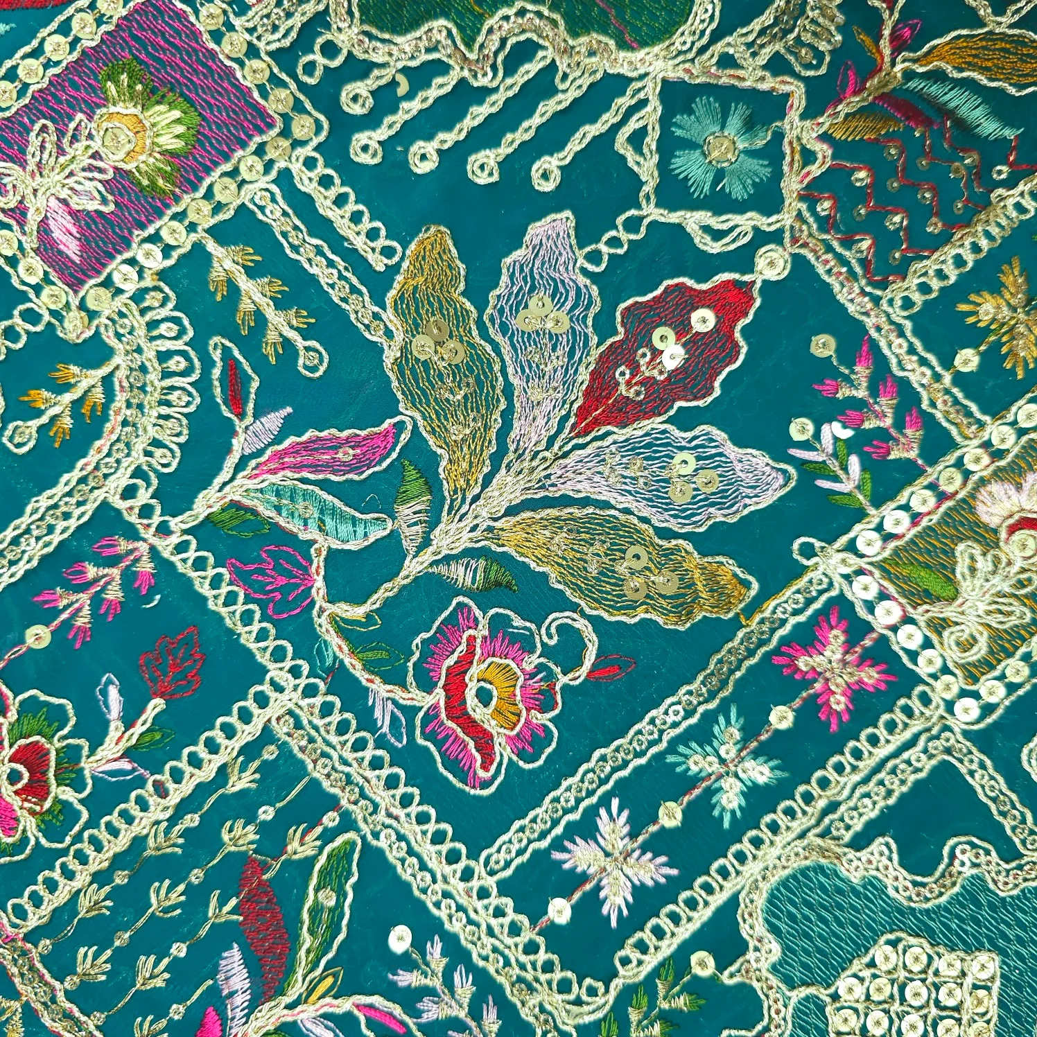 A regal fabric adorned with heritage-inspired multicolor thread embroidery and delicate sequin highlights. The intricate arrangement of floral, paisley, and traditional motifs brings out the timeless elegance of artisanal craftsmanship. Perfect for statement ethnic wear with a luxurious and festive appeal. Greenish blue