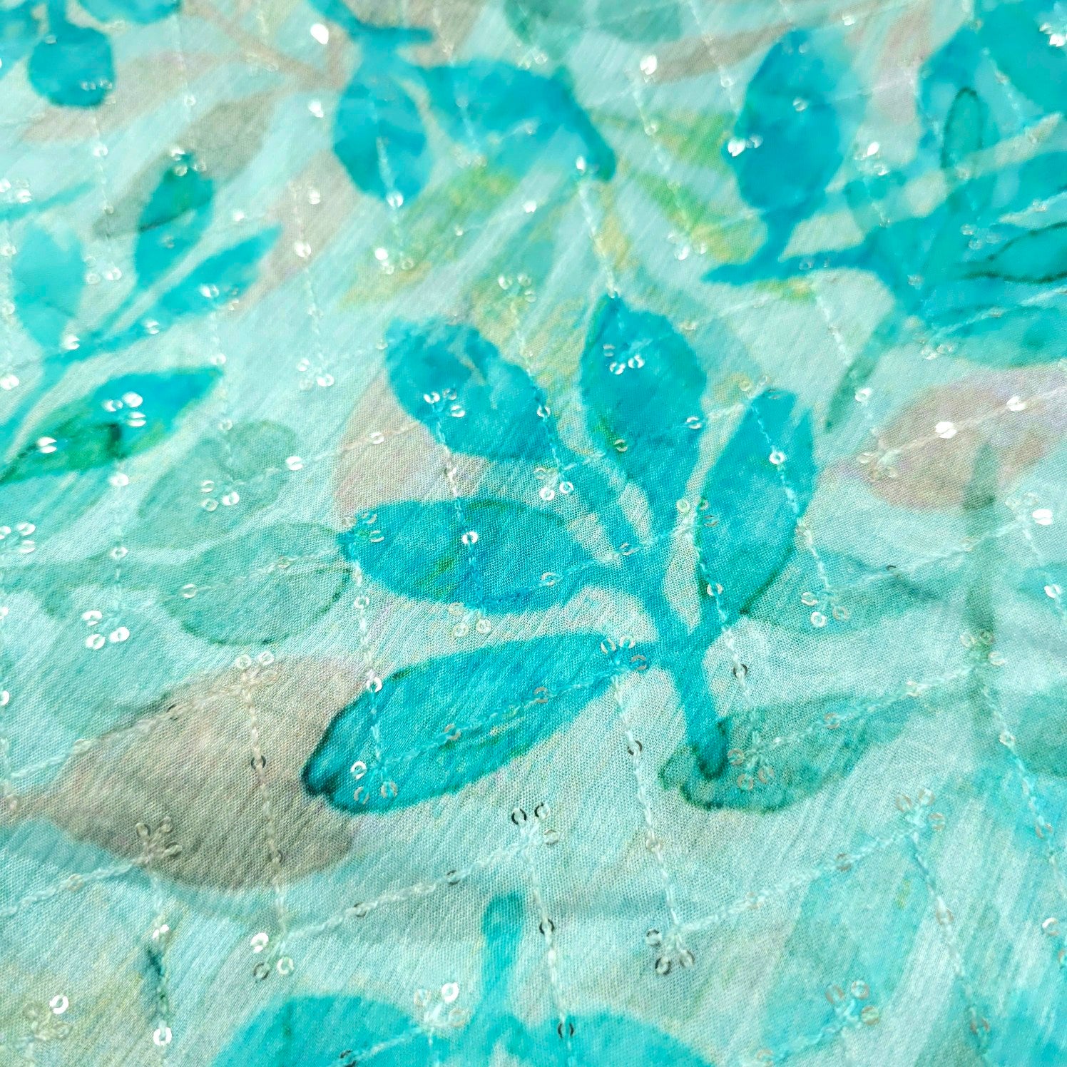 Riwaz Sky Blue Base Embroidered Chinon Fabric with leaf motifs
