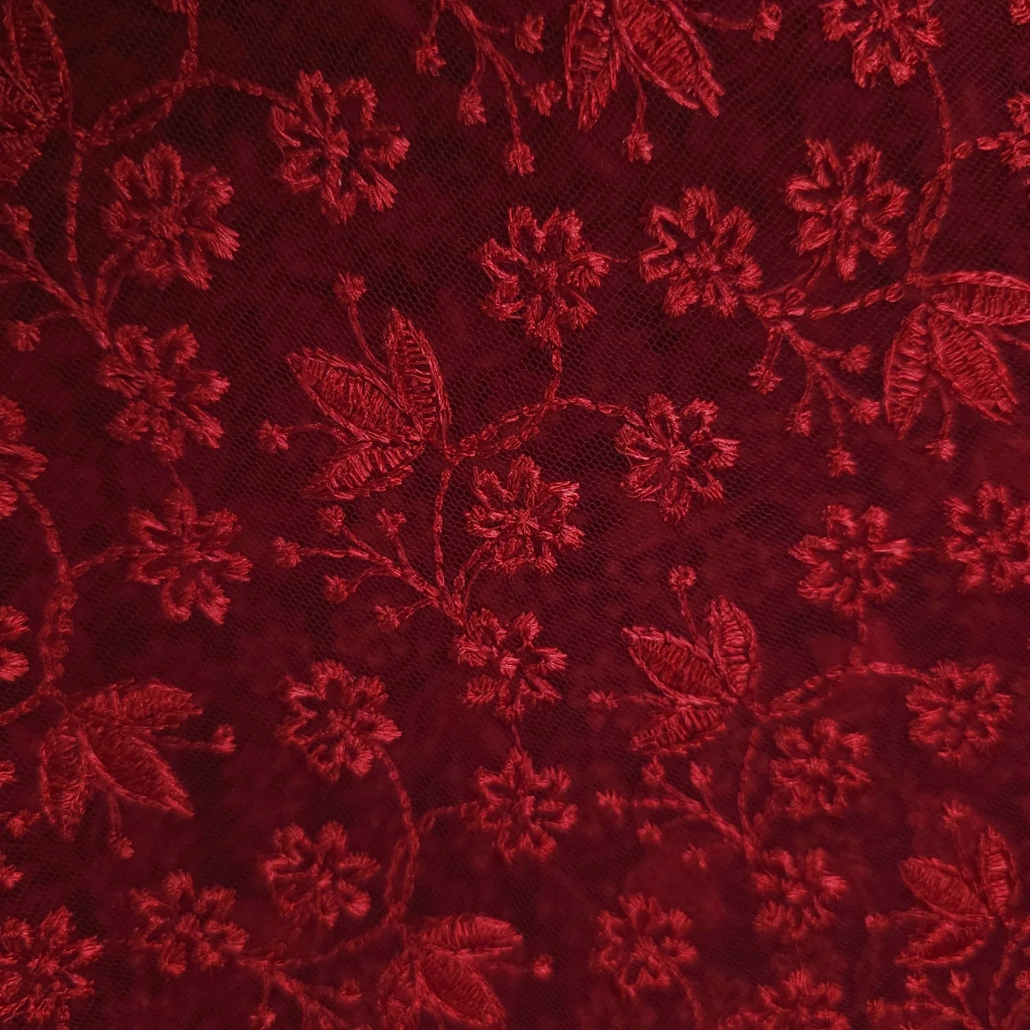 Vibrant red floral embroidered net fabric with a sheer base, adding a bold and festive charm to any attire.