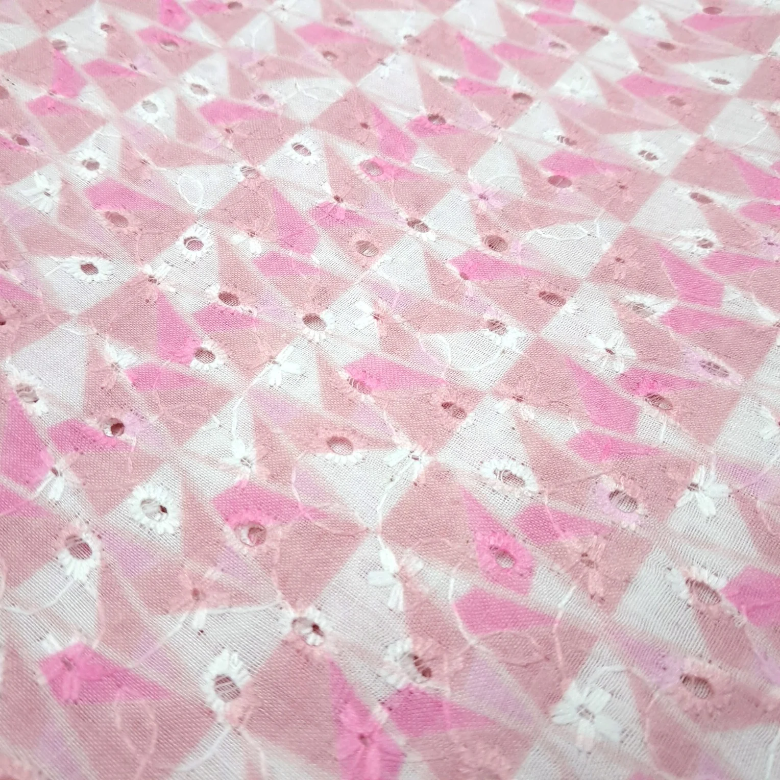 Delicate and breezy, this Hakoba cotton fabric combines intricate eyelet embroidery with cutwork and charming water color printed motifs on Pastel Pink base. Lightweight and breathable, it’s perfect for creating elegant summer wear like kurtis, tops, dresses, and more.